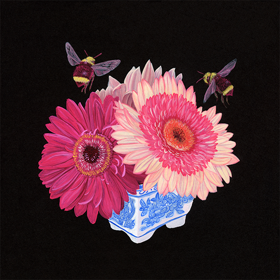 Gouache Bees Over Gerbera in Delf Blue - Limited Edition Print