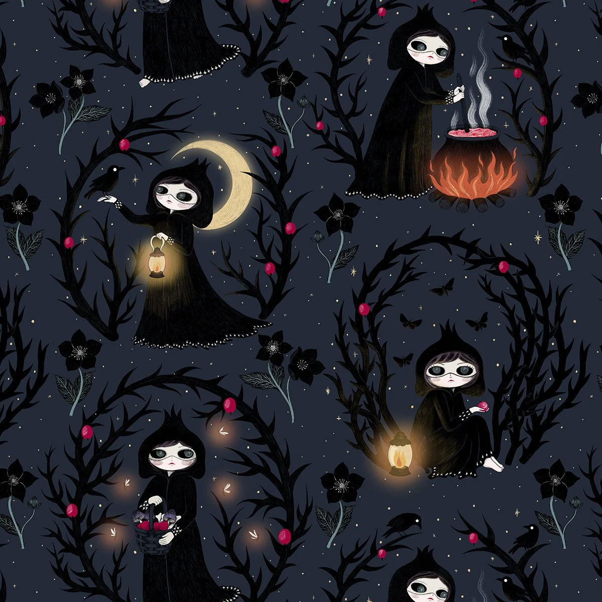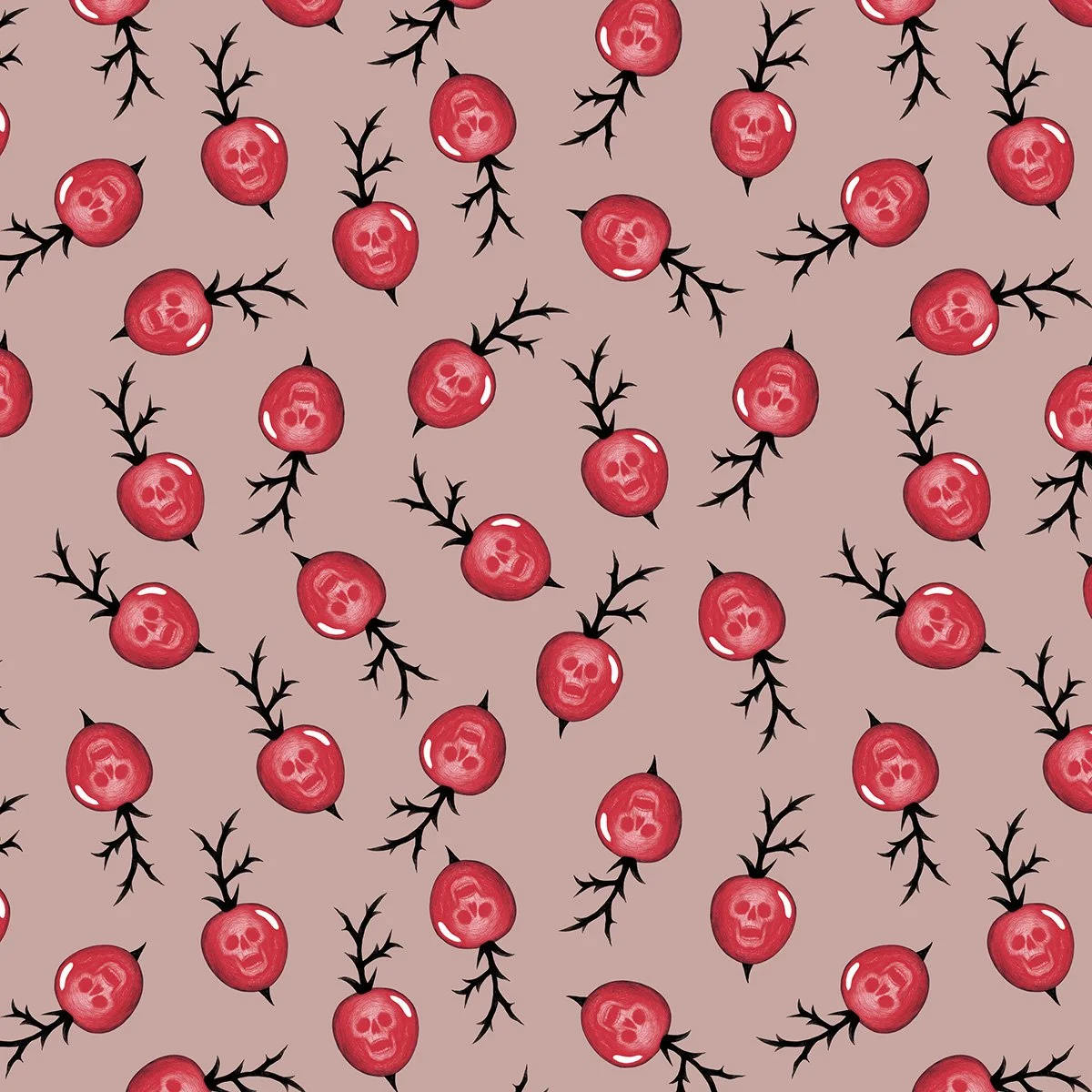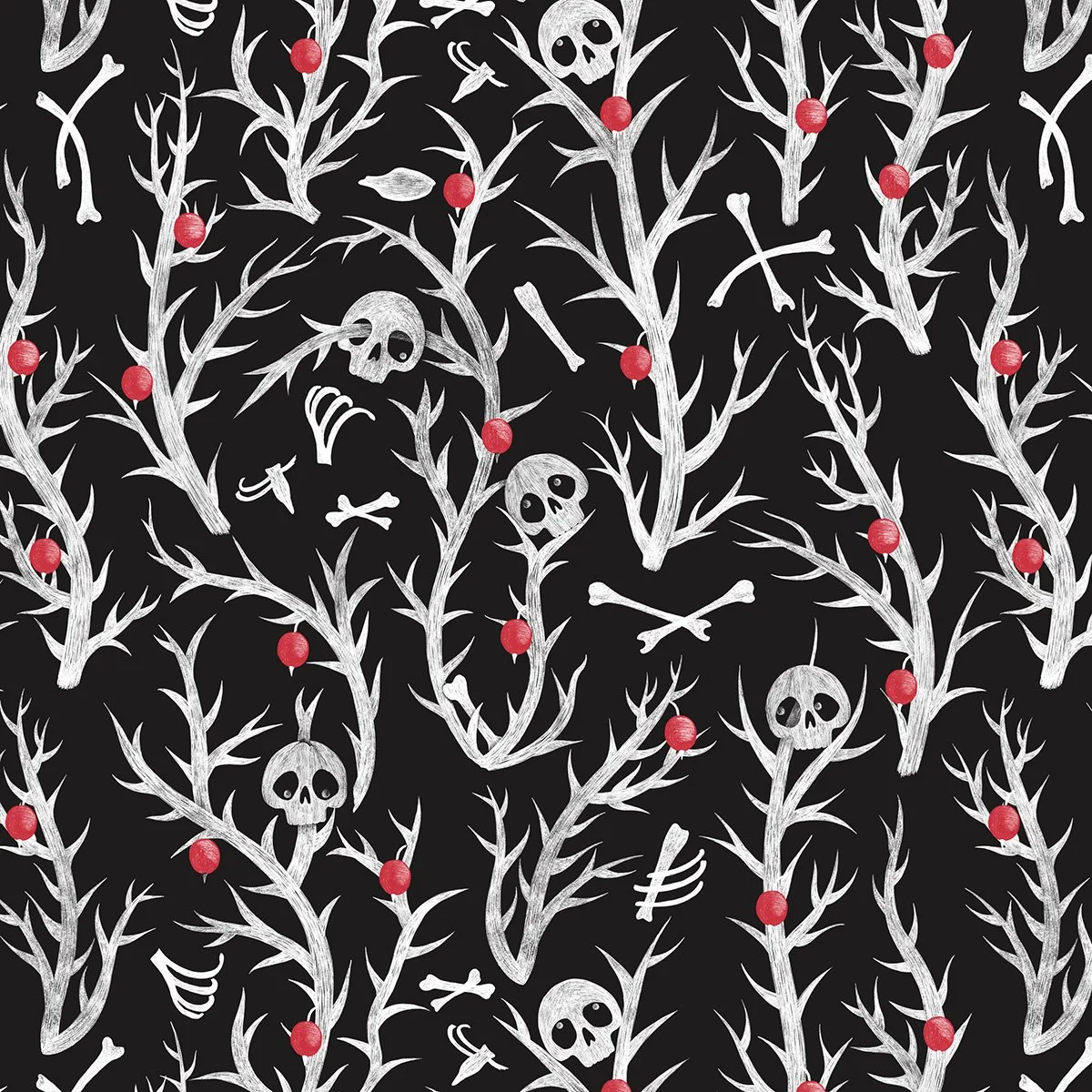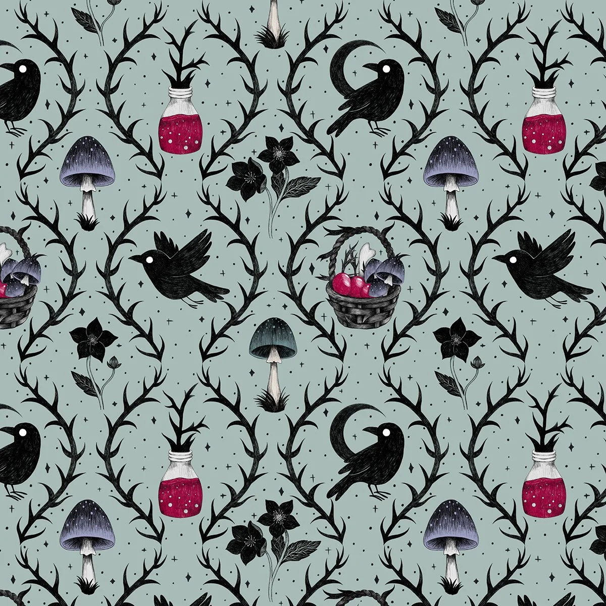 A dark fairytale pattern collection, made of tangled vines that come to life, poison skullberries, squawking crows and a witch’s new beginning. Each pattern is available in a variety of color options that can be found on Spoonflower.